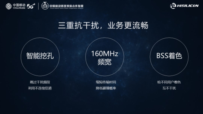 同时,为了保证业务体验更流畅,在抗干扰性能方面,双方在芯片层面基于中国移动智慧家庭业务的特点,提供了三重技术保障: