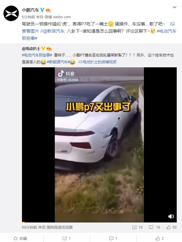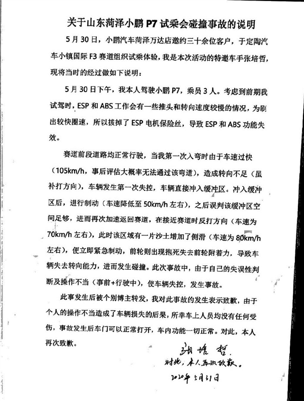 今天下午,小鹏汽车官微公开回应此事,并表示:“驾驶员一顿操作猛如“虎”,害得P7吃了一嘴土, 骚操作,车没事,散了吧~ ”,同时官微还晒出了视频主角车手张培哲对于此次事故的说明。