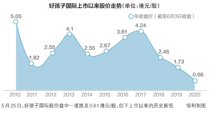 5月25日,好孩子国际股价盘中一度跌至0.61港元/股,创下上市以来的历史新低。截至6月3日收盘,好孩子国际报收于0.68港元/股。