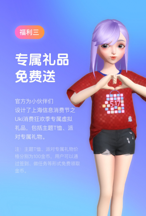Uki app还专门设计了上海信息消费节之Uki消费狂欢季专属虚拟礼品,包括主题T恤、派对专属礼物。这些虚拟礼品供用户免费使用。