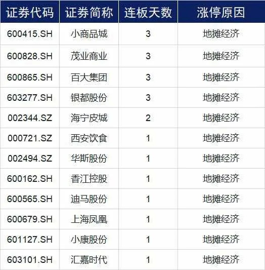 小商品城(600415)、茂业商业(600828)、百大集团(600865)、银都股份(603277)已经连续收获三个涨停,海宁皮城(002344)拿下两连板,西安饮食(000721)、华斯股份(002494)等多个个股涨停。