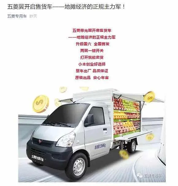 五菱汽车迅速抓住政策机遇,推出了一款方便摆地摊的售货车,根据“五菱专用车”微信公众号6月2日的消息,五菱荣光推出翼开启售货车,打开车厢即可卖货。