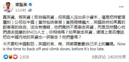 梁振英在脸书还提到,真英资、假英资在中国业务规模庞大,英国政府如果真的对香港特区的自由、法治有怀疑,他们竟然不是撤走英资,而是忽然关心他们过去抛弃的BNO人士,“你相信吗?”
