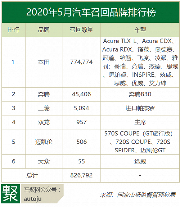 原标题:5月汽车召回排行:本田一家独秀,77万召回缘于“失速门”? 来源:车聚网