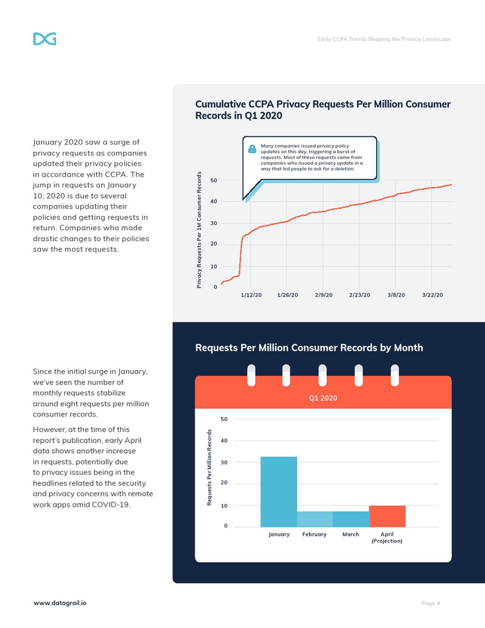 1月初出现大量的请求,这可能是由于法律生效和隐私政策更新。在本季度的最后两个月,每百万个请求中删除请求和访问请求的数量确实有所下降。但是,请勿销售请求在这段时间内始终保持稳定,预计随着时间的推移将成为主要请求。