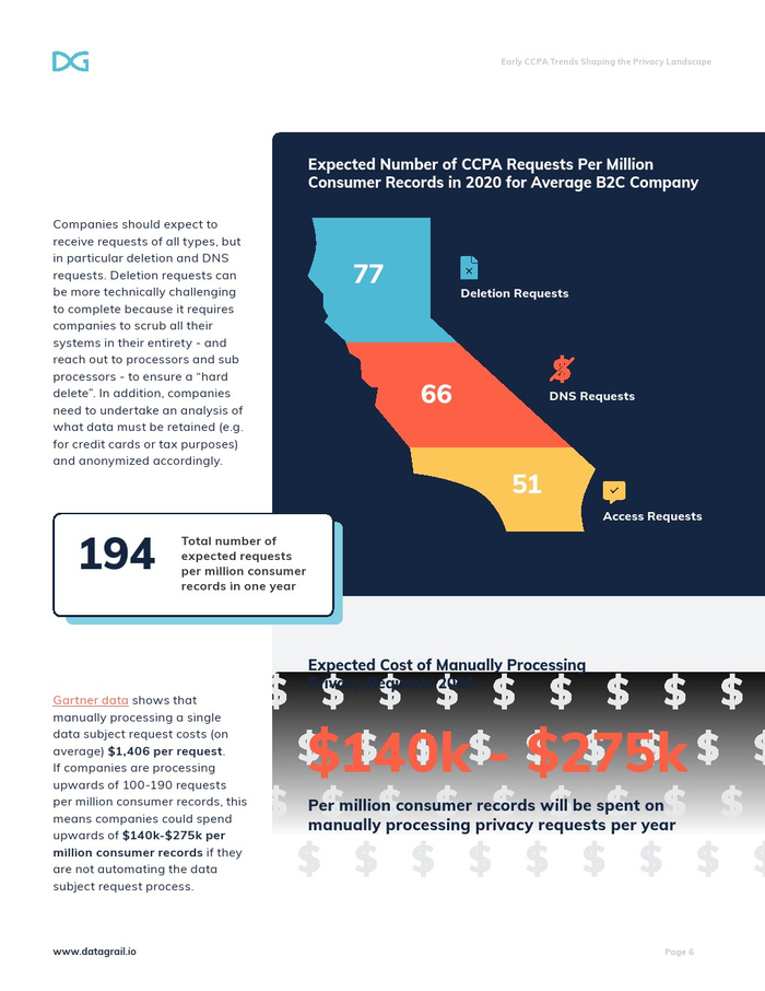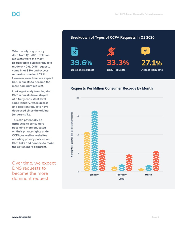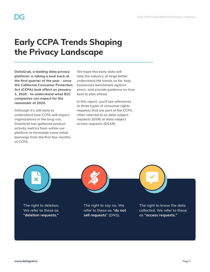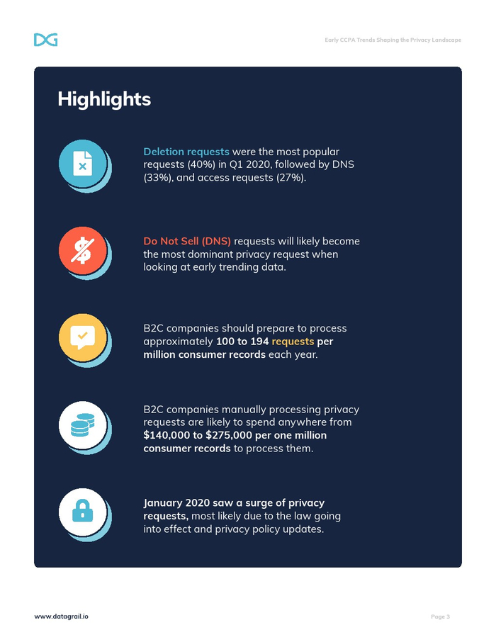 该报告分析了CCPA指南中概述的三种类型的消费者权利请求:删除权(删除请求);不出售请求;以及了解收集数据的权利(访问请求)。