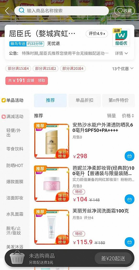 这也不难理解,平台的重心还是在外卖及相关的生活服务类目上,对于美妆类目的了解还存在一些偏差,将现有的平台流量转化成为美妆消费数据还存在一些难度,其流量的转化效能还没有能够达到平台所需要的程度。以饿了么平台为例,屈臣氏门店在平台的自然月销目前也还是处于一种比较惨淡的状态(当然不排除部分地区门店有做的好的)。