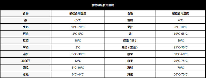 不少研究发现,不同食物在不同温度下会带来不同的口感,举个简单的例子,一杯4°C左右的可乐喝起来要比常温的可乐更好喝,刚刚出炉的面包吃起来总会觉得特别香特别好吃,放凉了就没有那种奇妙的口感。每一种食物都有一个最佳食温度,具体大家可以参考下面的表格。