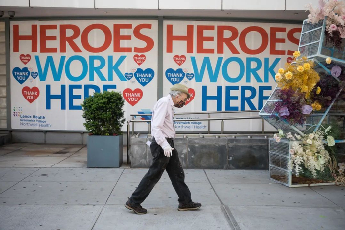2020年5月26日,一名老人从美国纽约一家医院旁经过 图丨新华社