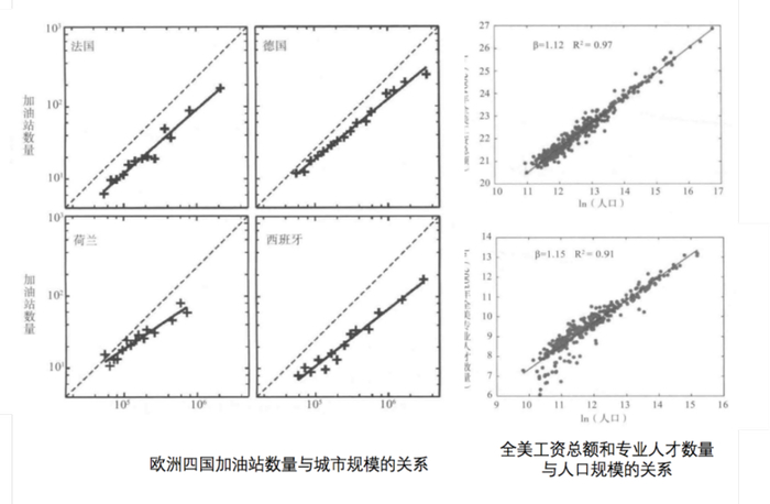 根据对多个国家的城市统计研究发现,以加油站数量、道路总长、水电煤气管道总长度等为代表的城市基础设施规模,约与人口的0.85次方成正比;而另一方面,工资总额、专利数量、人才数量等代表的城市产出规模,约与人口的1.15次方成正比。