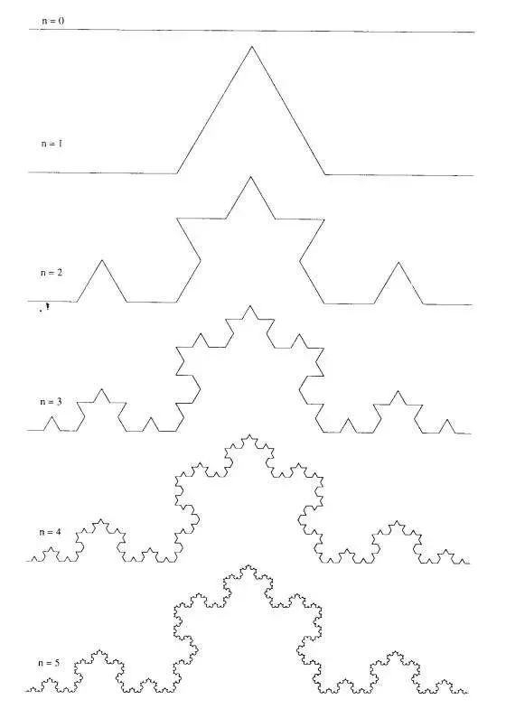 科赫曲线的分形:如果把科赫曲线的夹角无限缩小,一直分形下去,就会得到一条铺满整个平面的直线——从线变成面,从一维到二维,一个新的维度诞生了。