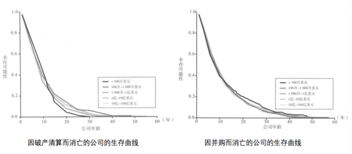 1950-2009年美国上市公司的生存曲线:破产清算和并购(并购看作一次消亡和重启)是企业消亡的主要原因,绝大部分企业的寿命在50年内。