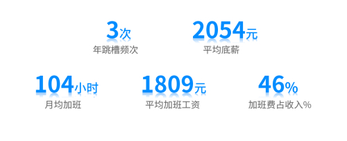 不同于白领的求职行为,蓝领群体有迥异的高频求职特征。基于安心记加班APP数千万用户数据统计,蓝领1年中主动求职和跳槽的频率是3次以上,月均底薪2054元,月均加班时长104小时,平均加班工资1809元,平均月流动率高达40%。基于安心云人事人企业用工数据显示,63%用工企业员工流失严重。