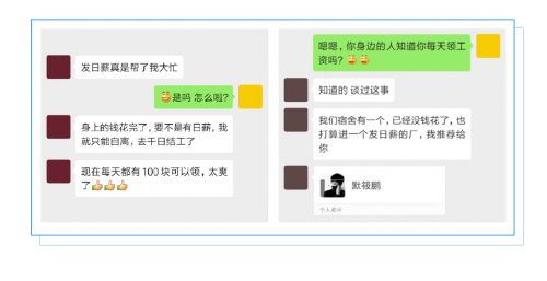 数据统计,昆山某人力公司使用“发日薪”给工厂输送员工,一个月内,员工留存率提升18%,招聘员工数量提升2倍,招聘成本降低21%,除成功帮助蓝领解决了生存问题外,发日薪还有效帮助人力公司解决了 “招人难、留存差”等问题。