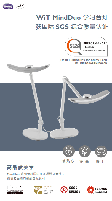 SGS学习台灯综合质量认证在台灯界甫一面世便奠定了权威性,有些台灯产品也许会为了申请认证标准而去主动提升产品规格,而有些产品虽然早已面世却已赶超新标准。真正的好灯不被定义,不以市面标准为终极目标,因为它们有自己的一套不断提升的标准。WiT MindDuo正是如此。