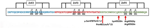 首先,研究人员确认了 WT1 基因上的突变位点,结果发现,在 DSD 患者表达的 WT1 蛋白的碳末端第 4 个锌指结构上(ZF4,一种特殊的蛋白质结构),存在了 5 种形式的基因突变。