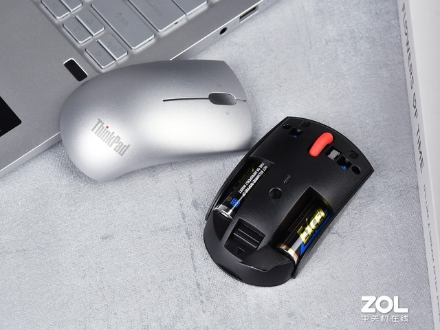 这款鼠标之所以被称为ThinkPad小黑鼠标双模版,原因就在于它增加了双模连接的方式,既可使用适配器连接,又可以使用蓝牙在多台电脑设备上进行连接,不用担心接收器丢了,连接不上等烦恼。它的外壳与本体之间采用了磁吸方式“连接”,想要更换电池、或者取出USB连接器的话,就需要从鼠标的尾部下方将顶盖抠起。ThinkPad小黑鼠标双模版本体非常轻便,但通过两节AA电池可以为鼠标配重,增加了鼠标的吸附感,从而增强操控手感。