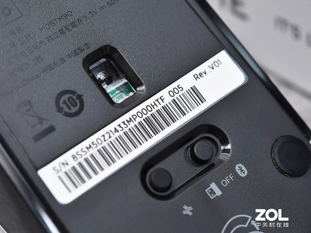 这款鼠标的底部设置有模式切换按钮,向左侧拨是2.4GHz USB无线连接模式,右侧拨是蓝牙5.0连接模式,中间可以关闭鼠标。