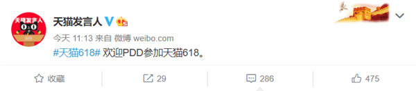 6月10日午间,天猫发言人,在微博上发布的一条消息显示:“欢迎PDD参加618”。就只有这一句话,没有进一步解释别的意思。