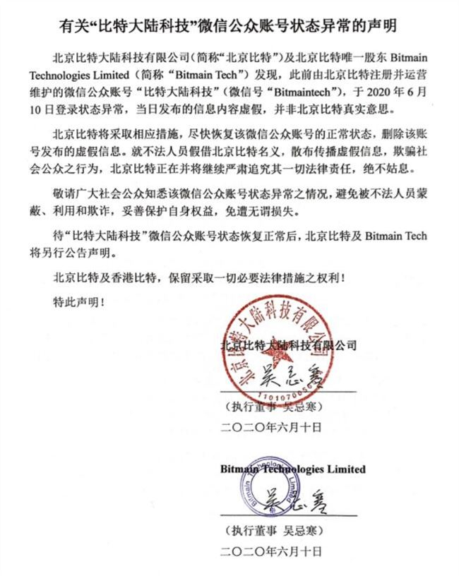 原标题:比特大陆:微信公众号异常 旧公章未作废 来源:ChinaZ