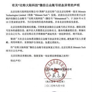 今日,比特大陆官网发布《有关“比特大陆科技”微信公众账号状态异常的声明》称,“比特大陆科技”公众号于2020年6月10日登录状态异常,当日发布的信息内容虚假,并非北京比特真实意思。