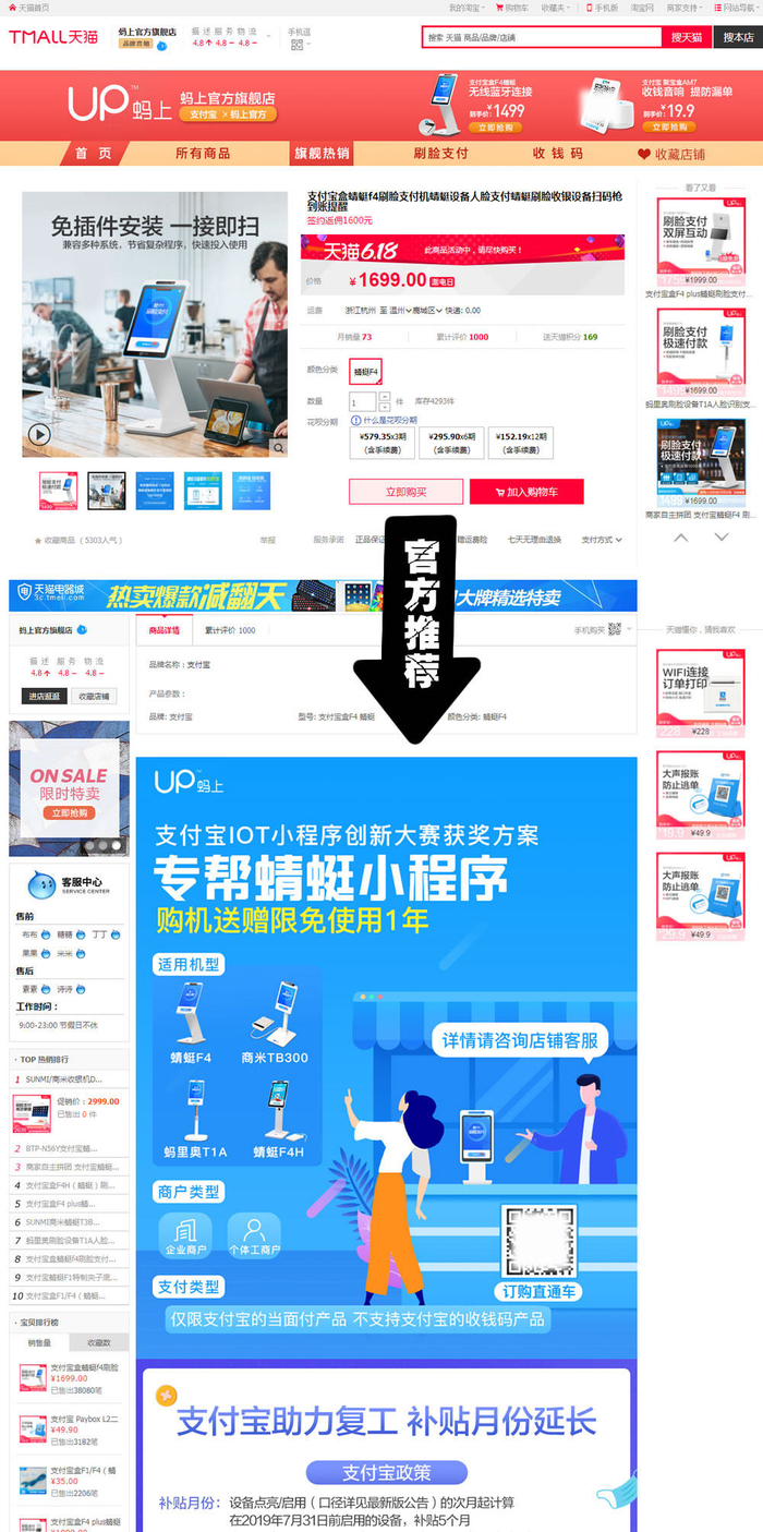 6月8号,该合作项目正式上线,目前,支付宝旗下蚂上官方旗舰店已经在首页和所有蜻蜓系列刷脸支付设备出售详情页开始引导推荐全国蜻蜓刷脸支付商户使用网付IOT数字化营销助手。根据双方约定,有支付宝负责宣导推广网付IOT数字化营销助手并落地到支付宝旗下全国蜻蜓刷脸支付商户。网付为其提供一年的软件免费使用服务。次年开始每年收取软件服务费999元/年。