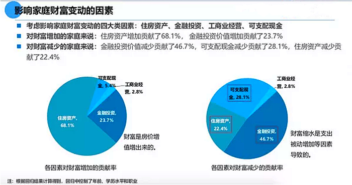 在报告中,对于财富增加的家庭,住房资产增加贡献了68.1%,金融投资价值增加贡献了23.7%。对财富减少的家庭,金融投资价值减少贡献了46.7%,可支配现金减少贡献了28.1%,住房资产减少贡献了22.4%。