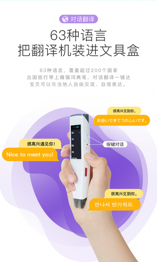 值得一提的是,糖猫词典笔支持中英日法韩俄西在内的63种语言对话翻译功能,只要按对话键,就能实现双语双向交流,不光是翻译外国人的语言,还能将中文翻译成外国语言,让孩子和外国人交流起来无障碍。另外,糖猫词典笔还特别增加了录音功能,方便学生在课堂上录重点。而这些是有道词典笔2 专业版不具备的,糖猫词典笔的功能更加丰富。