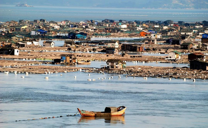 霞浦拥有700多平方公里的滩涂,滩涂上遍布竹竿、浮标和鱼排。潮水退去,海水冲积而成的虎皮状纹路浮现在海床,上万根竹竿由远及近,绵延数十里,蔚为大观。别小看了这些竹竿,每一根都是渔民们从山上的毛竹林砍下运输而来。每一根毛竹还要经过疏通竹节这一环节才能插入海底。