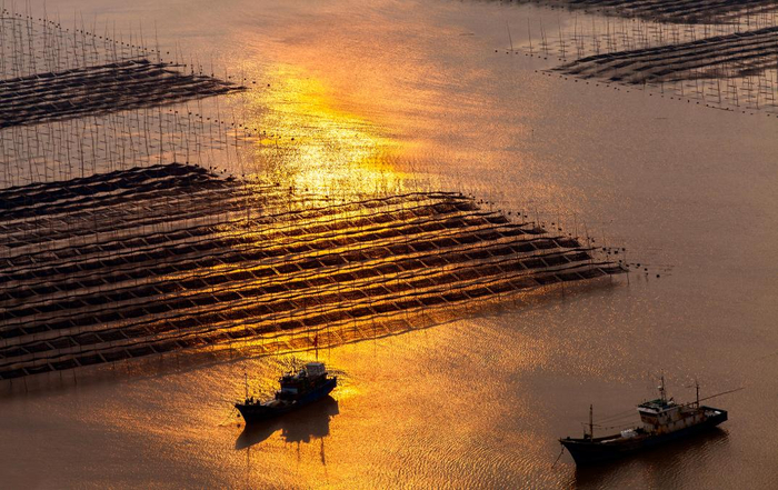 毛竹一根长16米左右,重200余斤,将它插入滩涂可不是容易的工作。落日熔金,暮云合璧,渔夫们穿梭在竹竿和鱼排之间。他们挖蛏拾贝,采收紫菜,修补渔网……那常年经受风吹日晒而遍布古铜色的身影被暮光镀成金色,这是农耕文化与海洋文明的结合,是独属于霞浦的地球脉动。