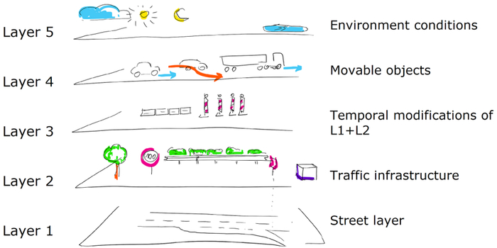 路网指车道级的道路信息,交通设施为实现交通管理、安全防护的道路基本设施,如交通标志、防护栅栏等。第三层则为临时性交通管理与控制,如车道临时封闭、改变限速等。第四层交通流是指道路上连续行驶形成的车流,古有“车水马龙” 之说,车如流水,马如游龙,也正是交通流的含义。最后一层环境条件则是天气等自然环境。