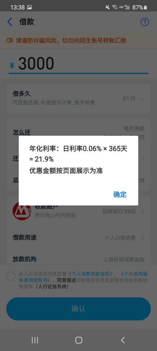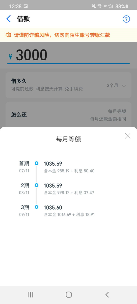 对比两者的费用,可以发现同样借款3000元分三期,借呗的费用相比拍拍贷减少了41%。