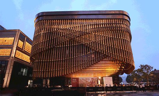 其中复星艺术中心地处 BFC中心地块内,建筑面积约4000 平米,是一栋地上四层地下三层的独立建筑。设计灵感来源于中国传统戏剧舞台,建筑外观最大的亮点是三层金色可转动幕帘,每天配合音乐定时转动。令艺术馆被称为一座“会跳舞的房子”。