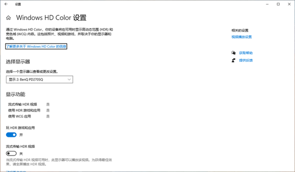在正常使用状态下,这款显示器的HDR模式是关闭的。用户首先需要到系统里开启“玩HDR游戏和应用”,且接入HDR的信号源,才能使用这款显示器的HDR模式。