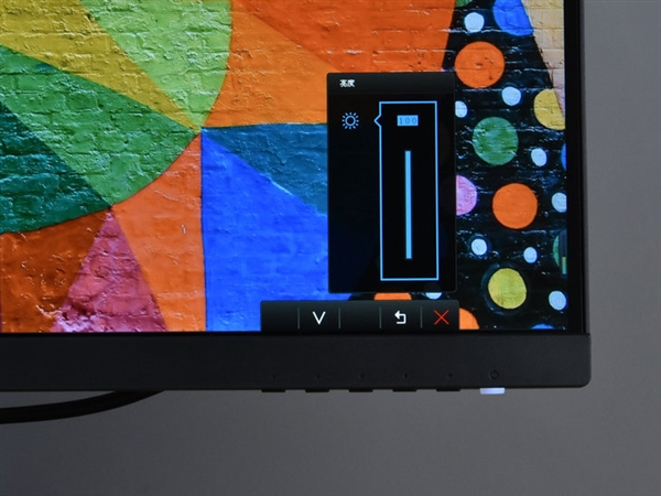 在屏幕下边框右侧的下方,还设计了一组按键,共6枚,从左到右依次为图像模式选择按键、信号输入按键、亮度调节按键、主菜单按键、取消按键、开关机按键。其中,当显示器开机运行时,开关机按键会点亮白色的指示灯。