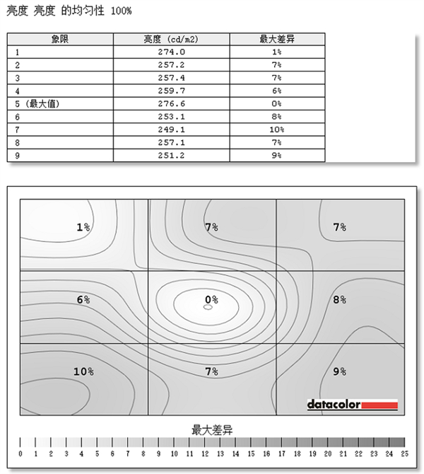 在亮度均匀性方面,在标准模式下测试,这款显示器中心区域(5号测试区域)亮度最高,达到了276.6cd/m2。它的左下角区域(7号测试区域)亮度偏差最大,差值达到了10%。在3000元价位的设计修图显示器当中,PD2705Q的亮度均匀性表现同样不错。