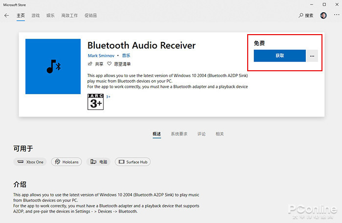 打开应用商店,搜索“Bluetooth Audio Receiver”(https://www.microsoft.com/zh-cn/p/bluetooth-audio-receiver/9n9wclwdqs5j),点击“获取”按钮,让Windows 10自动下载并安装“Bluetooth Audio Receiver”。