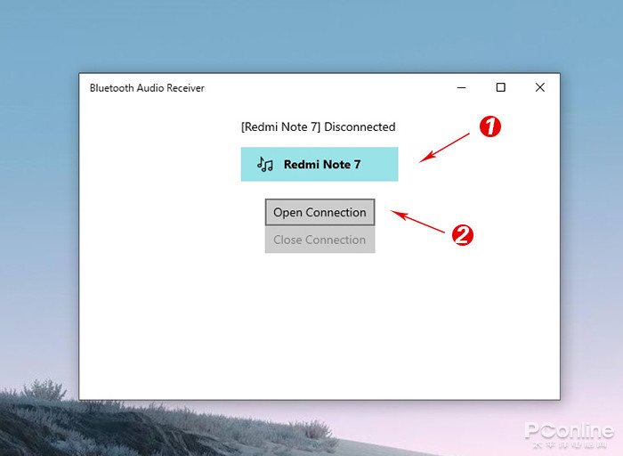 打开“Bluetooth Audio Receiver”,点击你的手机,此时下方的“Open Connection“按钮将被点亮。点击这个按钮,等待设备后面的”Disconnected“变成”Connected”,即代表电脑端已经准备好接收手机蓝牙传来的语音数据了。