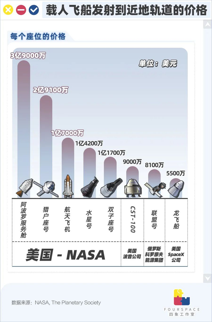名震月球的阿波罗飞船一个座位近4亿。这两年新搞出的猎户座飞船也好不到哪去,要价比航天飞机还贵。还有水星号、双子座号,一张船票也要上亿美金,和它们比起来,俄罗斯“联盟号”太香了。