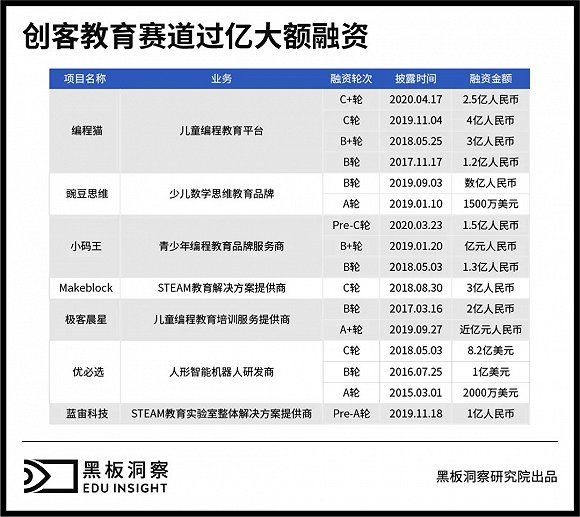 黑板洞察选取了146家创客教育公司进行了分析统计。146家公司中,有2家在新三板上市,另有83家获得融资。创客教育赛道过亿大额融资发生16起,其中编程猫4次融资过亿,优必选和小码王3次融资过亿,优必选C轮达到8.2亿美元。