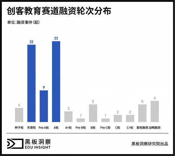 融资轮次多集中在A轮以前,其中获得A轮融资的有23家,获得天使轮融资的有22家,获得C轮及C+轮的只有Makeblock(童心制物)、寓乐湾、编程猫和优必选4家,融资轮次普遍不高。
