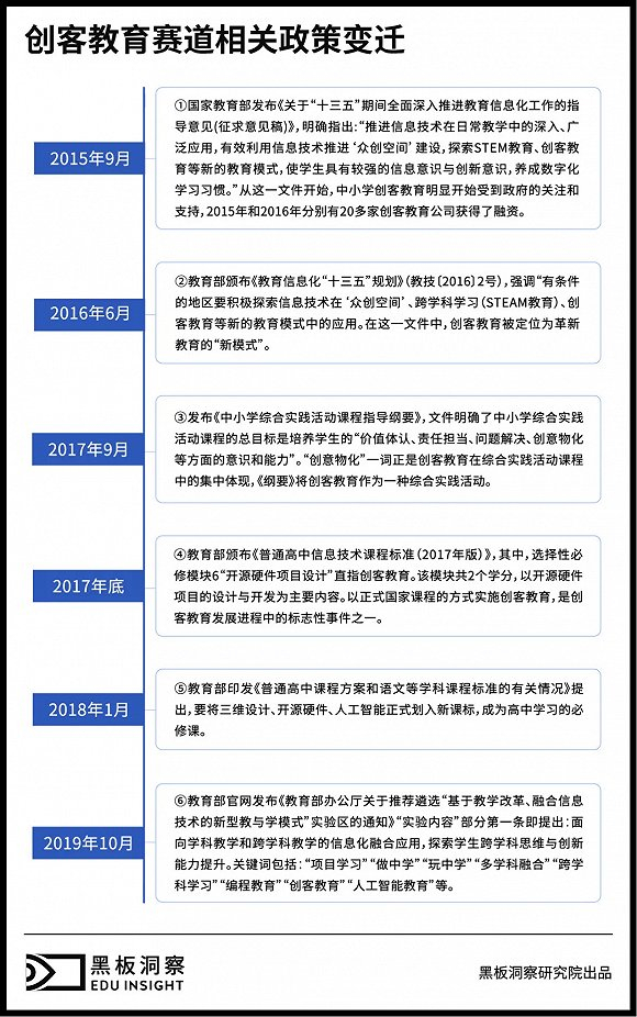黑板洞察梳理了国内近五年来对创客教育较有影响力的政策,基本可以从中看到创客教育在中国的发展历程。