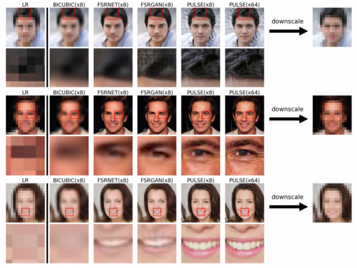 不过,过度虚化产生的人像只是一种虚拟的新面孔,事实上它并不存在。正因如此,这项技术不能用于身份识别。比如监控摄像头拍摄的失焦、无法辨别的图片,不能通过PULSE还原成真实存在的人像。