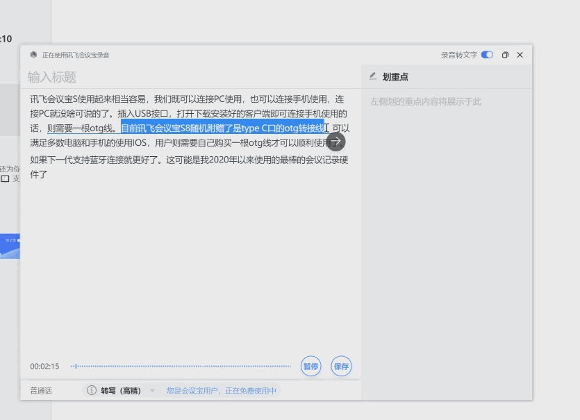 从上面这个测试截图可以看到,语音转文字是实时进行的。不论是字母、单词还是数据还有标点符号,识别的准确率几乎是100%。在PC端还可以通过选中文字,点击划重点按钮直接将特定的语句单独加入到划重点区域。