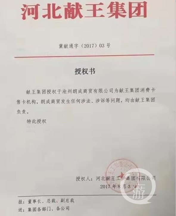 上游新闻记者获得的一份献王集团的授权书显示:献王集团授权沧州朗成商贸有限公司为献王集团消费卡售卡机构,朗成商贸发生任何涉法涉诉等问题,均由献王集团负责。