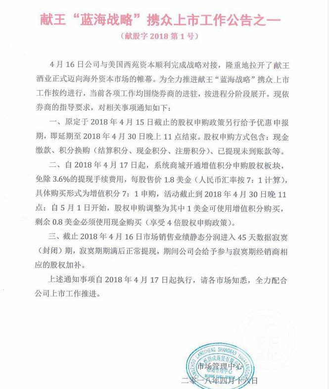 投两万赚八万,四倍的投资利润,显然难以为继,2018年2月,献王集团宣称,其联合西苑资本打造的“中国王酒”即将在美国纳斯达克挂牌上市,开启资本市场运作,因为上市做准备不再返还投资人本金与收益,将原来未返还的本金改为股权,并要求投资人缴纳980元股权证工本费,此时的股权认购也被称为2.0模式。