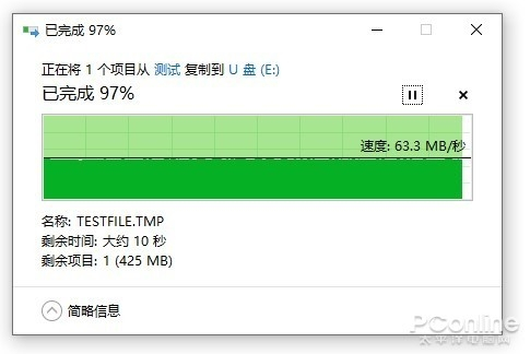 在实际测试环节,通过手动在存储卡和固态硬盘间对拷20GB大小的测试文件来测试读写速度,这张TF卡的的读取速度稳定在90MB/s附近,写入速度稳定在63MB/s附近,表现跟上两项测试结果比较接近,卡的稳定性依旧非常出色,全程几乎没有明显的波动。