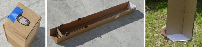 简化版的暗箱不需要从暗箱内侧观察,只需要哪怕一个手纸或厨房纸的卷筒就可以制作。在卷筒的一侧平平地粘上锡箔纸再扎小孔,再用保鲜膜,或者半透明的蜡纸,把另一侧粘成比较平整的接收屏幕就可以了,这样就可以在半透明屏幕的外侧看到太阳的像。
