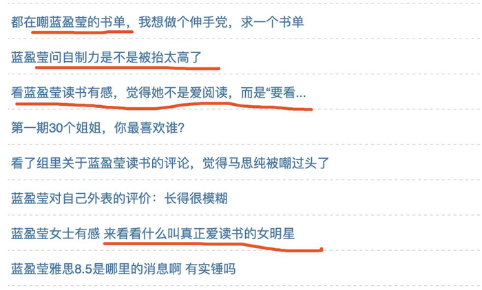 人们发现没有太大「文学造诣」的蓝盈莹,她看的书基本上也都是网络书店畅销排行榜的前十名,充斥着一些成功学和比较没什么深度的言情小说。