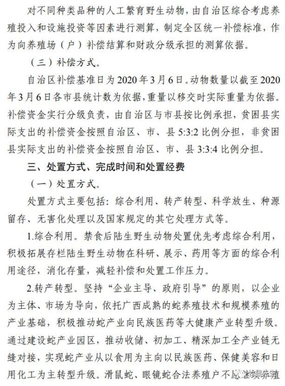 近日,自治区林业局和财政厅就依申请公开了《广西人工繁育陆生野生动物处置指导意见》的通知,对12类人工繁育野生动物的处置方式和补偿标准做了说明。